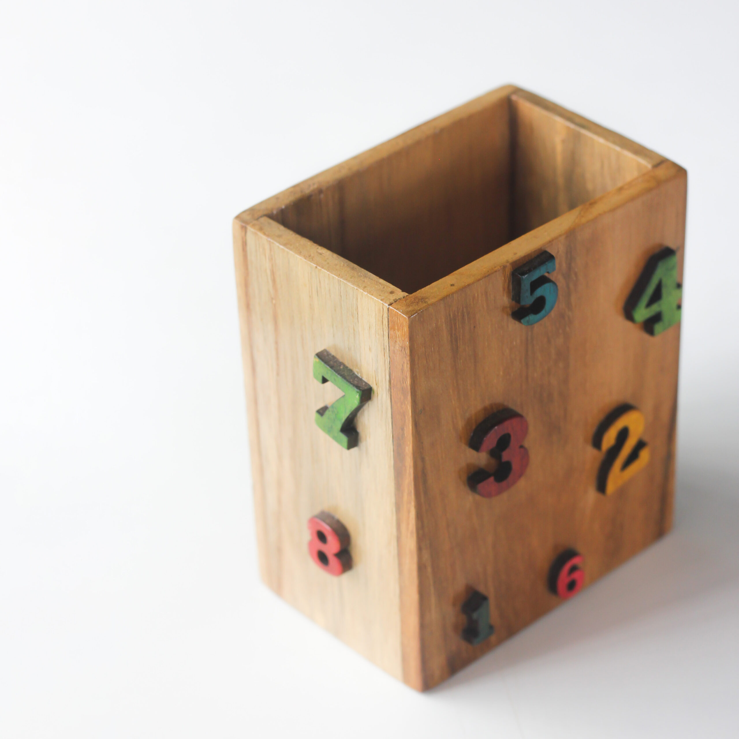 Wooden Pencil Holder with Decorative Numbers made with reclaimed teak wood – eco-friendly desktop organiser for kids, teens, and adults; perfect birthday gift and stationery storage.