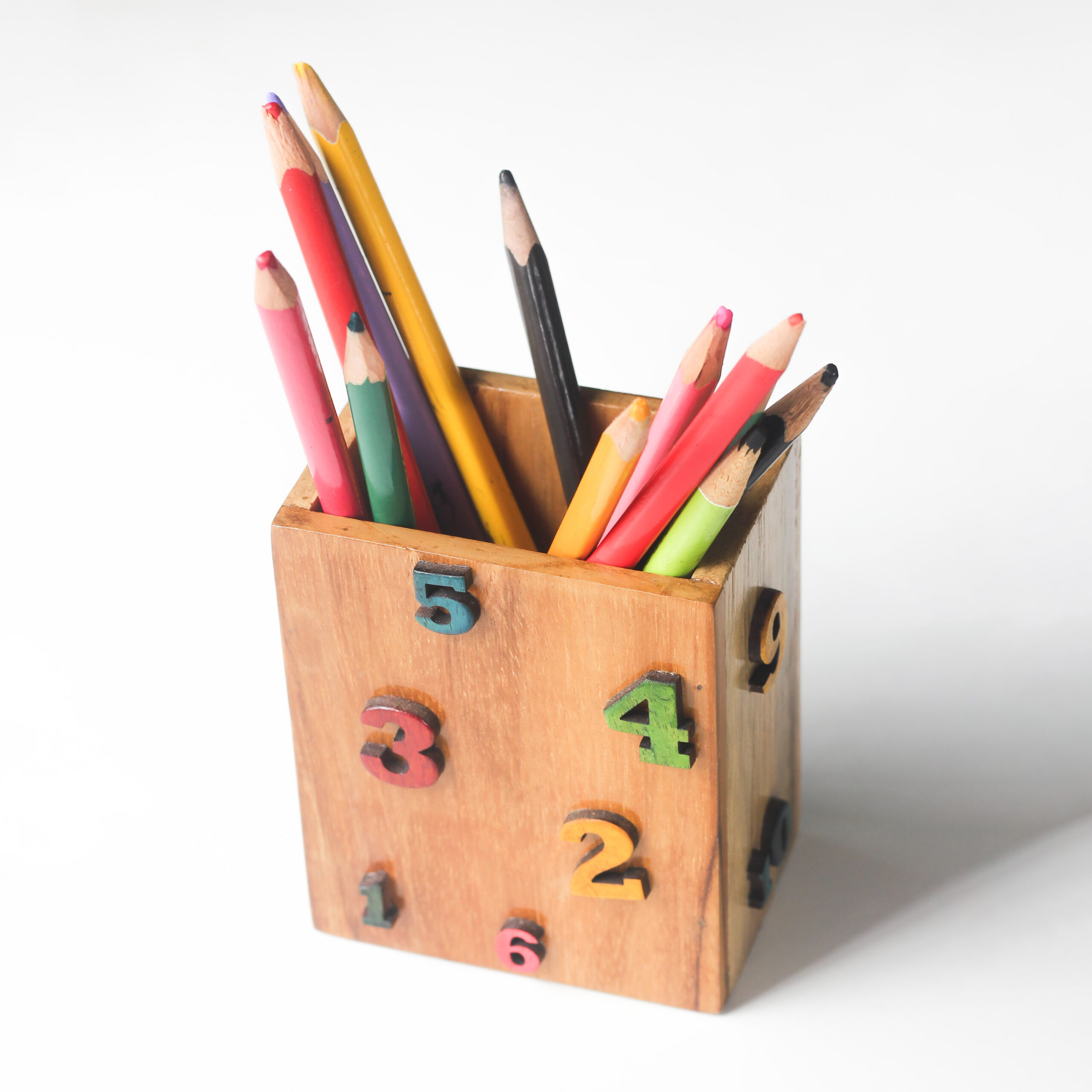 Wooden Pencil Holder with Decorative Numbers made with reclaimed teak wood – a stylish and eco-friendly desk organiser for coloured pencils and stationery. Perfect birthday gift for kids, teens, and adults